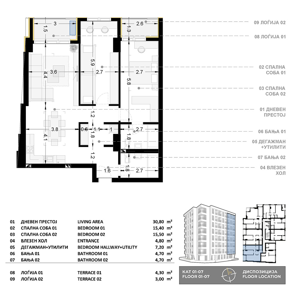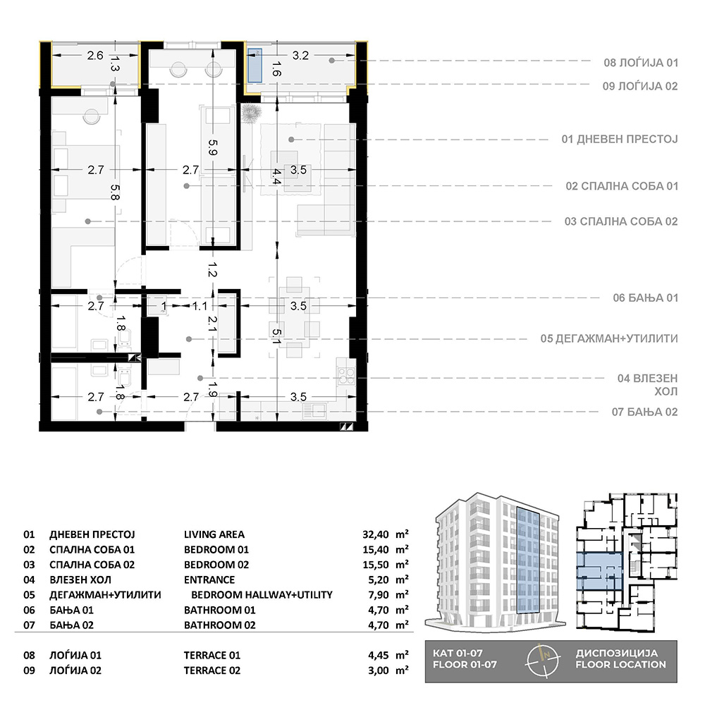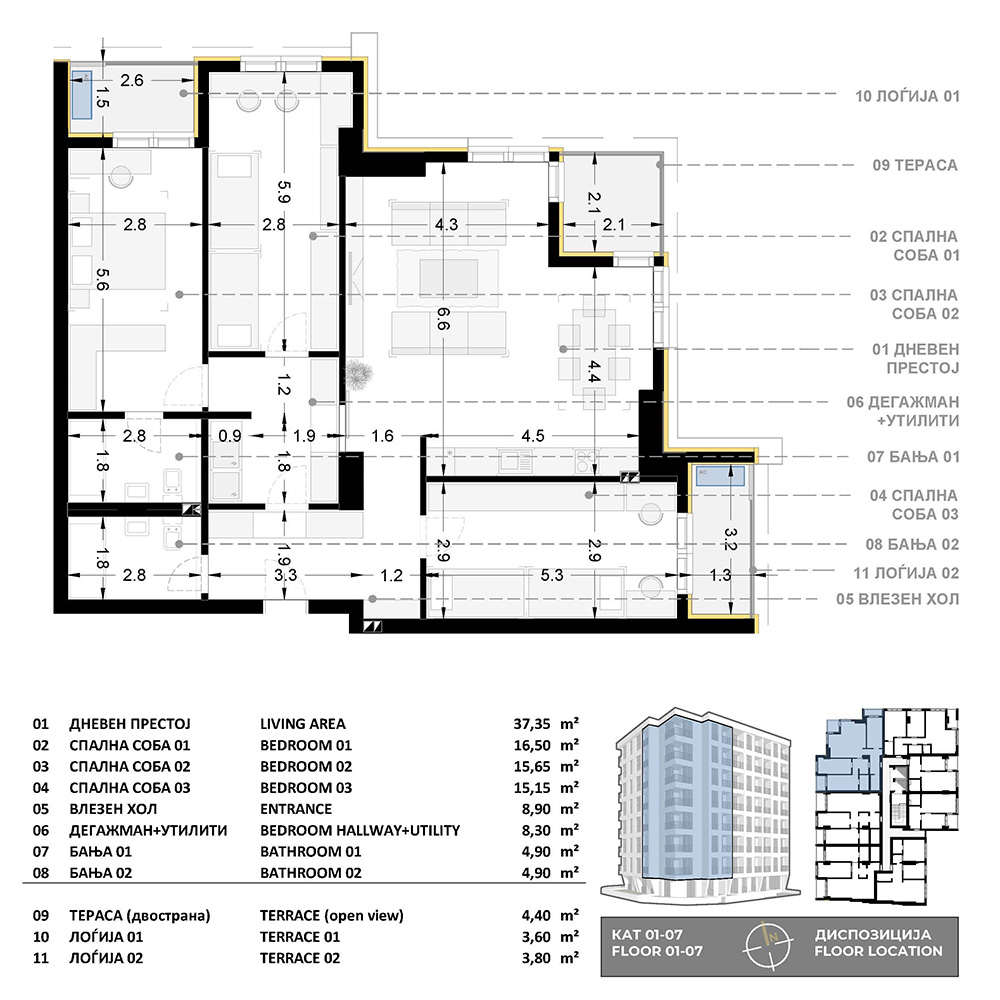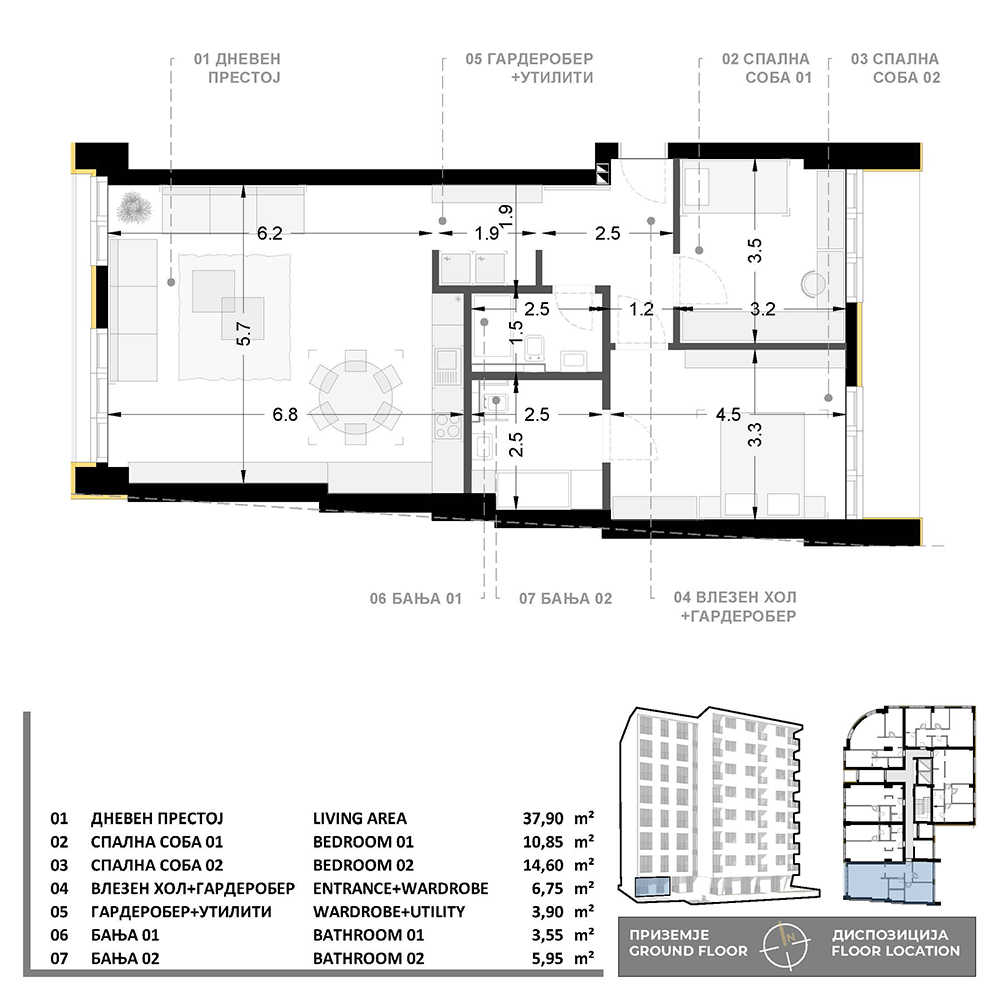 | ТИП | СПАЛНИ / БАЊИ | м2 | БРОЈ НА СТАНОВИ | ДОСТАПНИ СТАНОВИ | ОСНОВА НА СТАН |