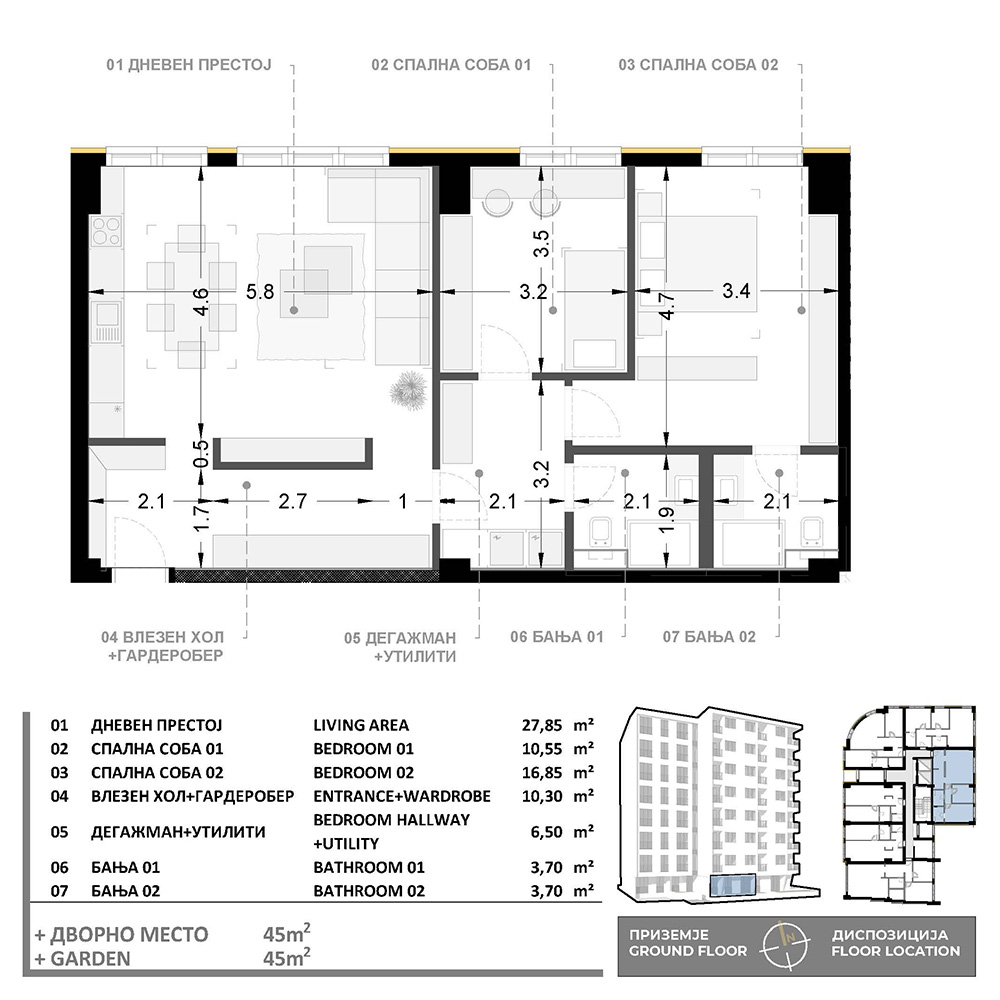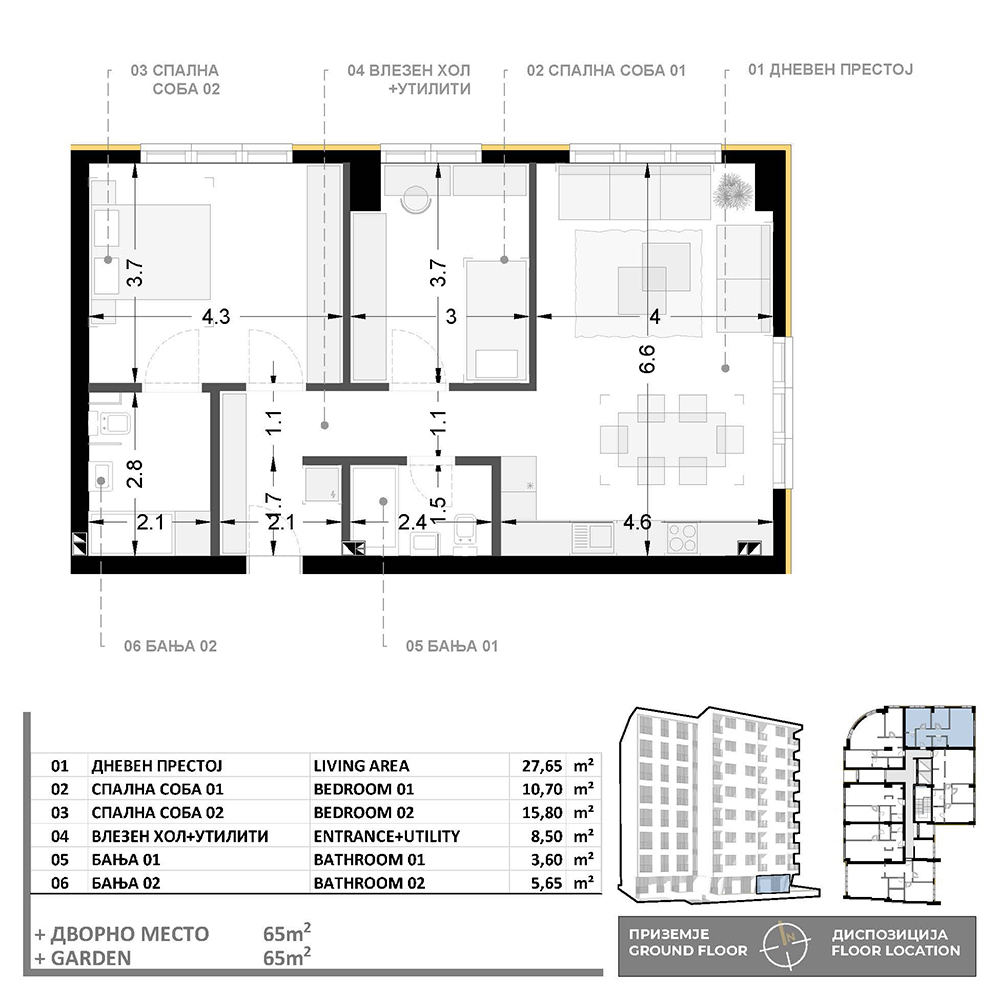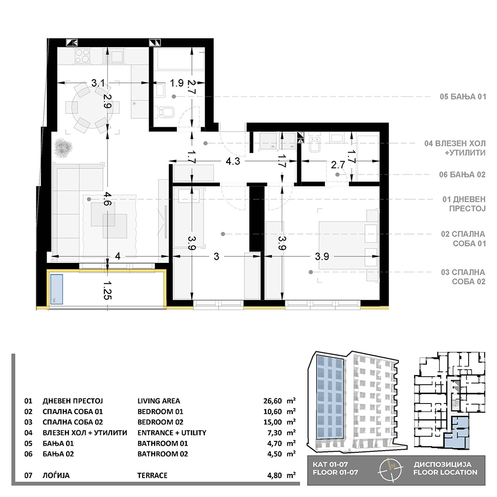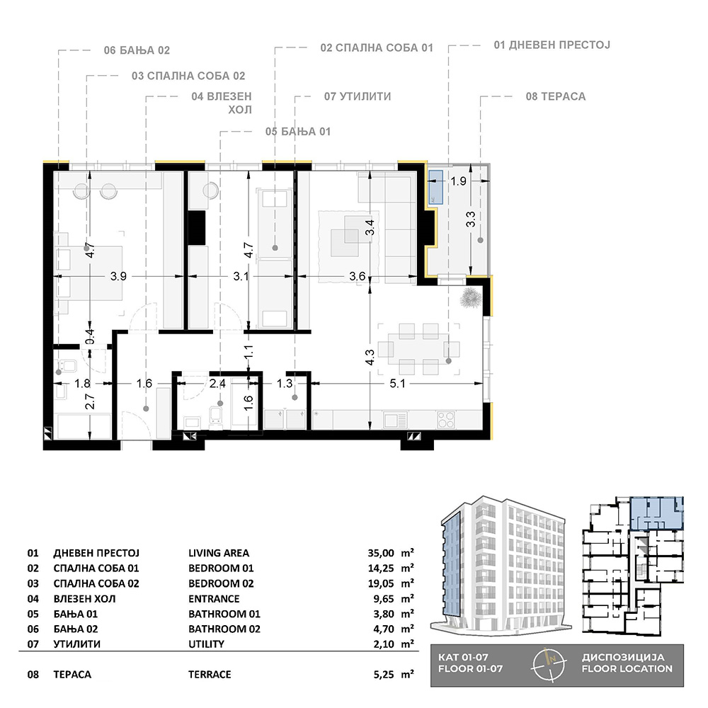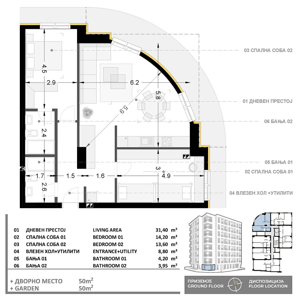 | ТИП | СПАЛНИ / БАЊИ | м2 | БРОЈ НА СТАНОВИ | ДОСТАПНИ СТАНОВИ | ОСНОВА НА СТАН |