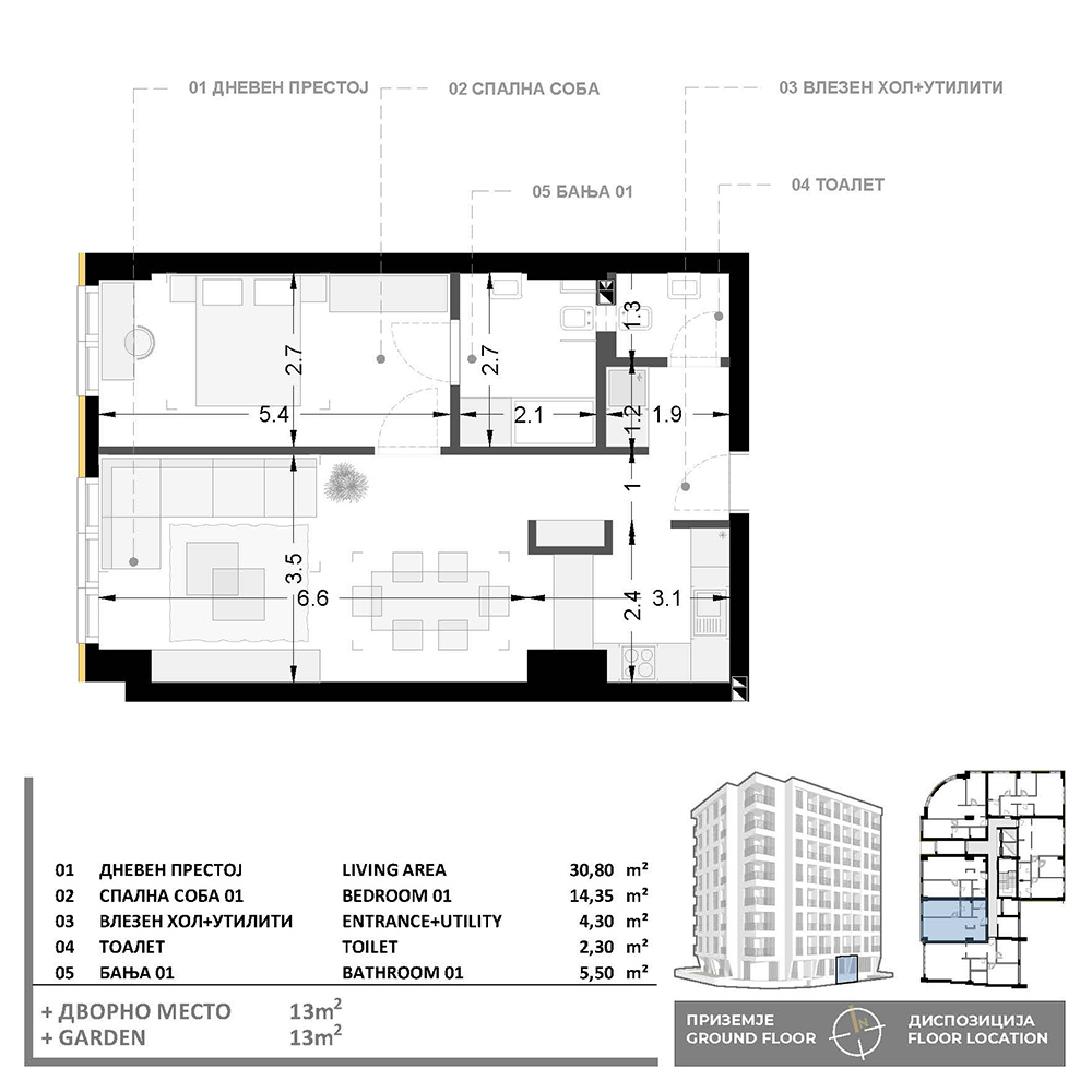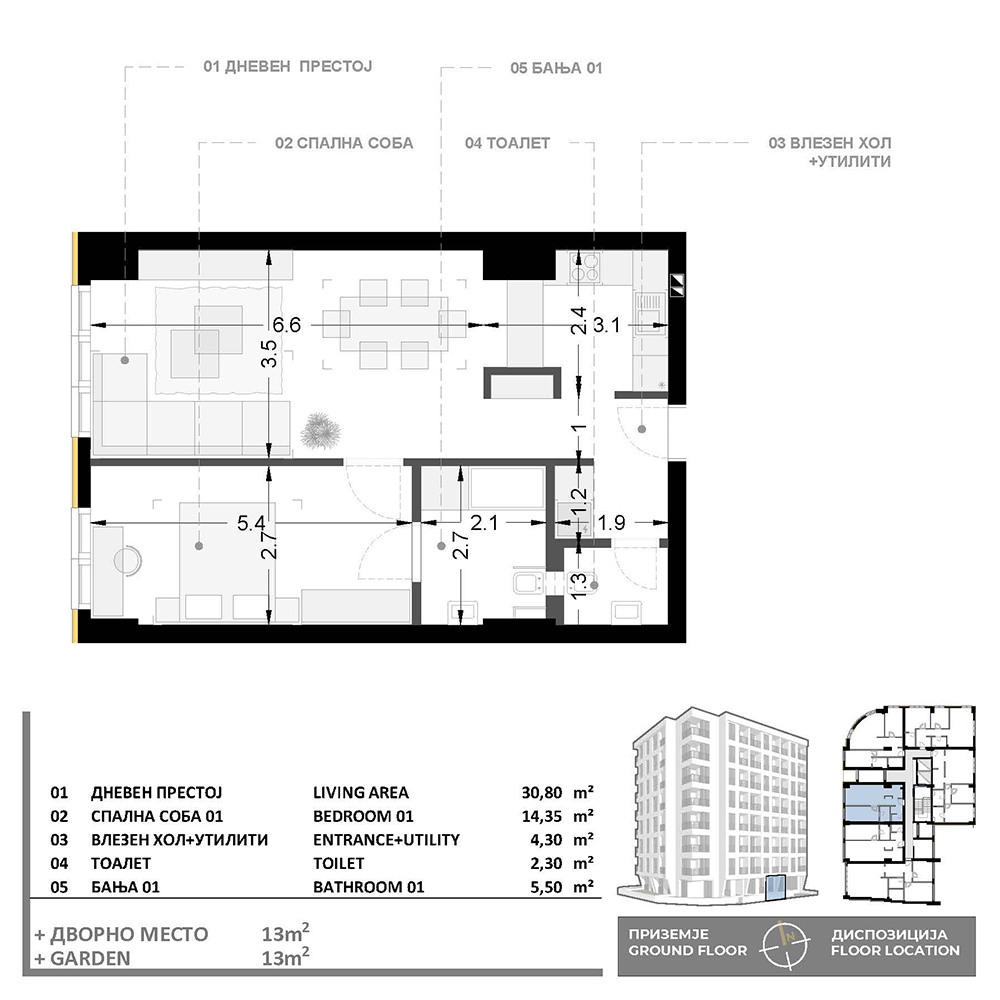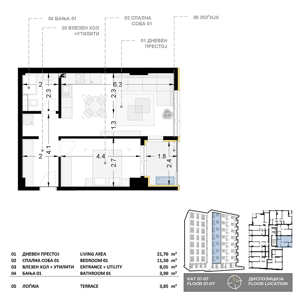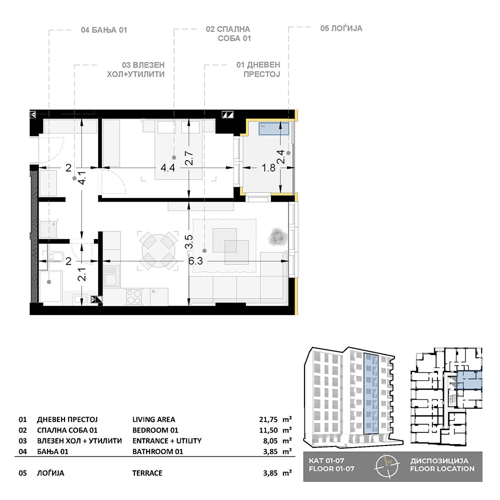 | ТИП | СПАЛНИ / БАЊИ | м2 | БРОЈ НА СТАНОВИ | ДОСТАПНИ СТАНОВИ | ОСНОВА НА СТАН |
