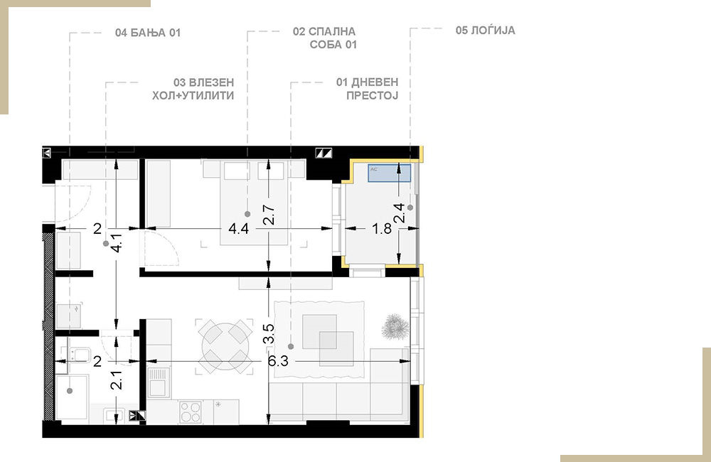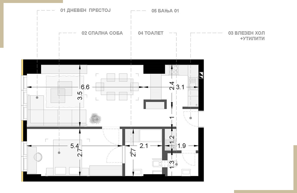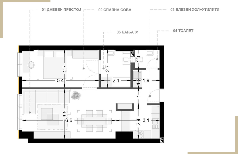 Овие станови со една спална соба се идеални за сите кои бараат комфорен и функционален простор за живеење. Дневните простори се отворени и светлосни, со модерно опремени кујни и пространи трепезариски делови. Главните спални соби нудат удобство и приватност. Надворешните делови се убаво организирани, со тераси или балкони кои нудат пријатен простор за одмор и уживање. Становите располагаат и со современо опремени купатила, што ги прави совршен избор за модерен начин на живеење. Постојат 4 различни типови на овој вид станови.
